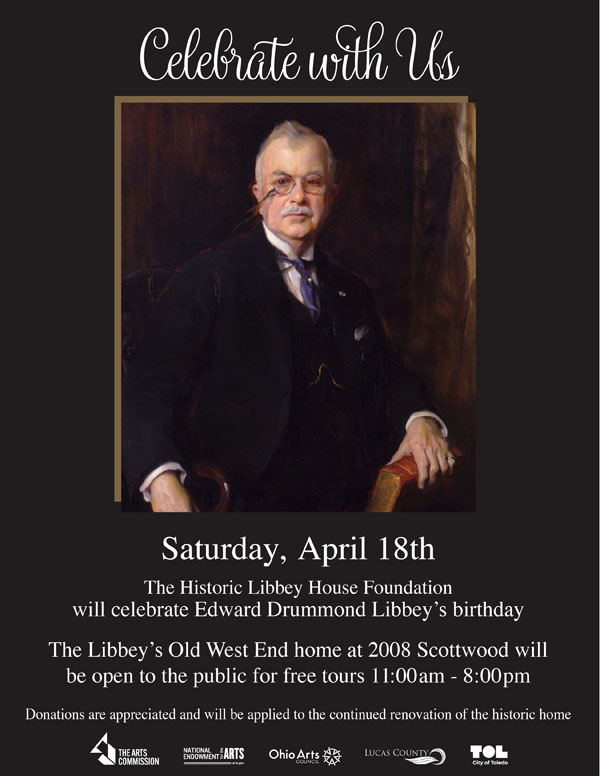 Saturday, April 18th we will be celebrating the late Edward Drummond Libbey’s birthday with a FREE open house tour of all three floors of the historic Old West End mansion sponsored by the Toledo Museum of Art. Join the Libbey House Foundation and TMA as we commemorate the glass industry giant and art museum founder. The Libbey House will be open to the public from 11:00 am – 8:00 pm in celebration of the 125th anniversary of the Toledo Museum of Art.